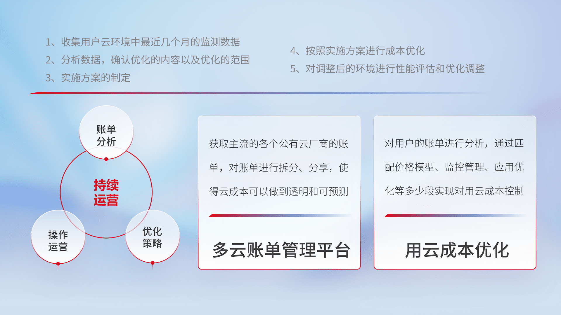 通过多云纳管,,,以统一的资源数据模型把客户的云资源进行抽象和封装,,,,进而实现对多云资源的统一操作,,,保障云资源管理的可靠性、、稳定性与可用性。。。。量身定制化运维内容,,,,配置、、、、开发运维、、、、补丁管理、、备份、、、、监控、、、、认证和访问管理、、、审计和日常巡检等,,,保障在用云过程中的可靠度,,,稳定度以及高可用率。。。。