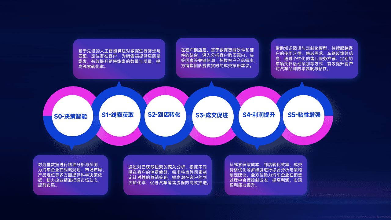 基于销售转化漏斗的薄弱环节,,,为客户提供数据+模型+运营的智能应用,,实现销售业绩的提升;推动线索管理全链路的精细化管理和运营。。